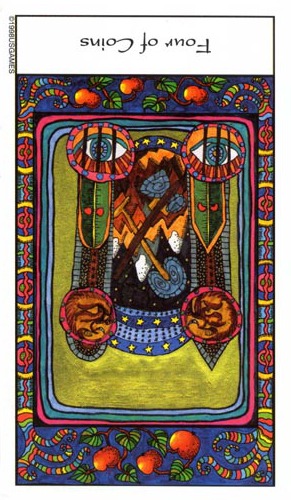The 4 of Pentacles is about holding on to what you got. The number 4 represents structure and order, and fits well with the suit's element, Earth.