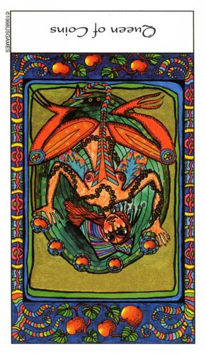 The Queen in the suit of Pentacles becomes aware of her Earthly attributes; she's reliable and sober, able to give good advice.
