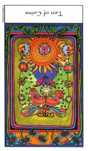 The 10 of Pentacles represents material posessions. The number 10 of Pentacles forms the links to the Ace (first card) of Wands (the first suit in the minor Arcana), and thus prepares to bring you back to the beginning of the minor Arcana, ready for a next cycle through the tarot.