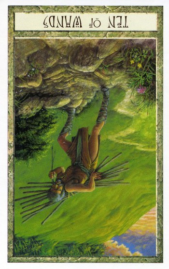 The 10 of Wands is therefore the transition from the element Fire (associated with Wands) to the element Water, associated with Cups. As you might imagine, this not the easiest of transitions.