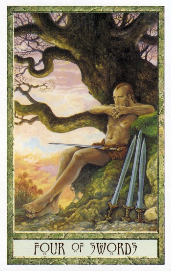 4 is the first number in the cycle of giving things shape. It's about making things real. The element of Swords also relates to making things real, so this enhances the effect so much that arrogance can cause you to exhaust yourself.