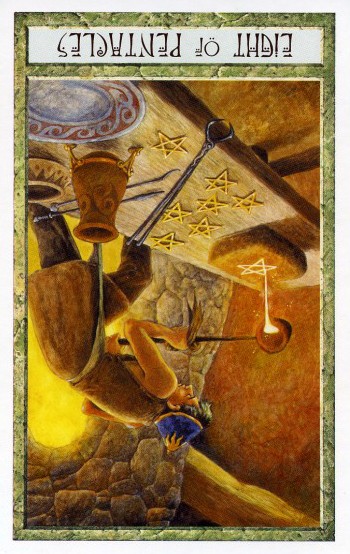 The 8 of Pentacles is about keeping up the hard work you're doing, and trying to be happy about doing that work at the same time. While the 3 of Pentacles is about completing a masterpiece, the 8 of Pentacles is about doing the apprentice work that makes you a master of your trade.