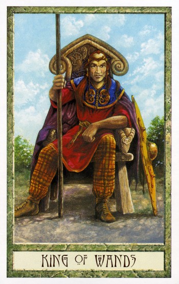 The King of Wands uses the properties of Wands (vitality, optimism, enthousiasm) to go out with confidence. He is seen as a leader with charisma.