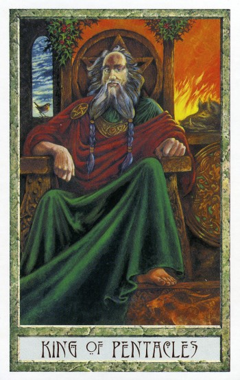 The King of Pentacles uses his Earthly attributes to rule. He goes about his work like an old style business man; he avoids unnecessary risks, aims for real results, and acts from confidence.