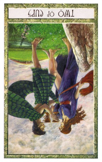 This the first assignment number of the Cups suit. Unlike Wands, with the Fire element, Cups, with the water element, has a lot more patience. Water is by nature more introspective, and this second card in the Cups suit is indeed about exploring yourself. The outcome is uncertain as always, but it usually results in better acceptance of yourself.