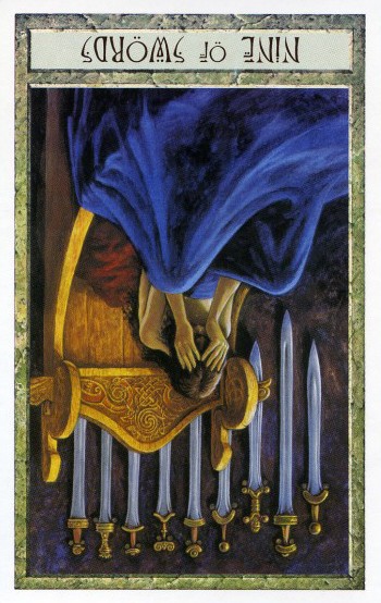 The 9 of Swords represents relief from cropped-up grief. The number 9 is a number of reward and rest and accomplishment. In the element of Swords there is not a lot of time for rest, but without any rest you'd just burn yourself out.