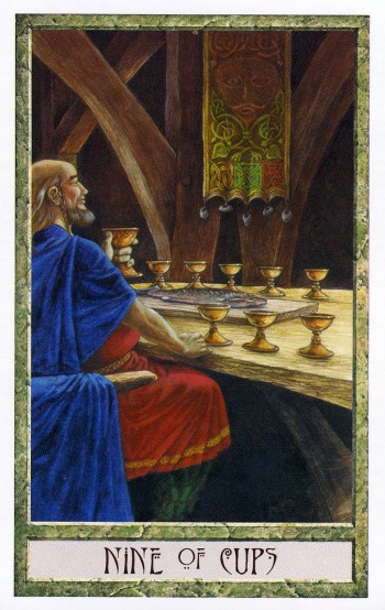 The 9 of Cups represents achievement and contentment. It is an excellent time to take some rest and enjoy yourself.