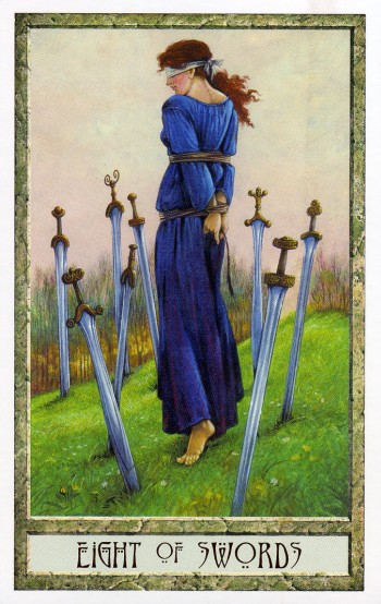 The 8 of Swords is about slowly regaining strength and energy. The 8 is an assignment number, and in the element of Swords it's a bit harder than usual.