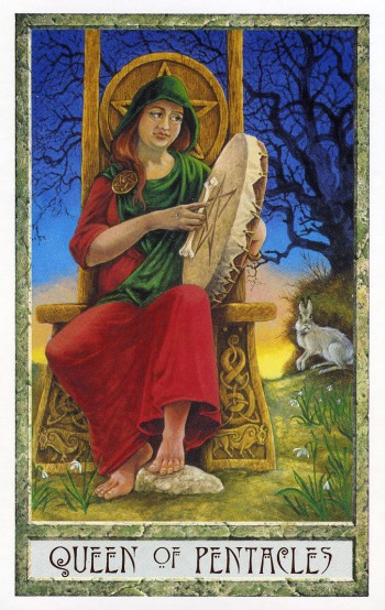 The Queen in the suit of Pentacles becomes aware of her Earthly attributes; she's reliable and sober, able to give good advice.