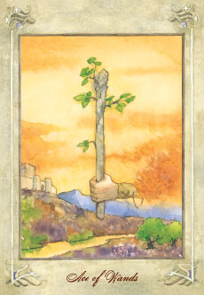 The ace of wands represents the beginning of an idea. The element fire and the number 1 give a powerful combination: enterprise and new beginnings apply to both. This is an energetic combination, which is why the card is generally considered a positive one. Spring is the season associated with this card.
