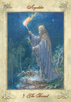The Hermit shuts out the world and retreats into solitude to better understand some spiritual aspect of life. He opens to the cosmos and lets it's wisdom sink in. Hermits are often seen as wise old men who can guide a traveller along a journey.