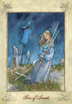 The 5 of Swords is about facing reality. The 5 is an assignment number, and in the slighly more difficult suit of Swords, it means you face a difficult challenge where your past experiences could hold you down.