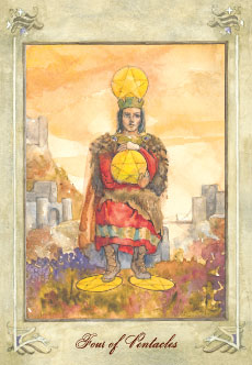 The 4 of Pentacles is about holding on to what you got. The number 4 represents structure and order, and fits well with the suit's element, Earth.