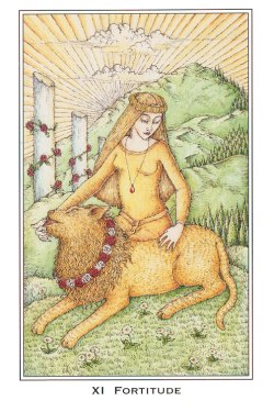 This card carries the number 11. In the Rider-Waite deck, Strength and Justice have swapped places because Waite saw links with the astrological signs Leo and Libra.