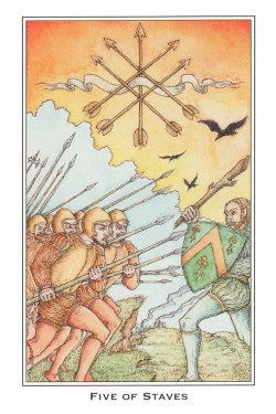 The 5 of Wands represents competition. The 5 is the second assignment number, and therefore a difficult card. 5 combined with the Wand's element fire challenges you. You'll have to fight hard for your idea, but you stand a good chance of succeeding.
