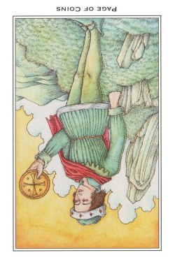 Pages explore and gather information about the road ahead, with an almost naive attitude. The Page of Pentacles is sometimes described as a bridge builder; Pentacles is the suit where the actual work is done, and the Page here enables those that follow to quickly cross difficult terrain.