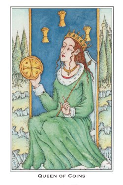 The Queen in the suit of Pentacles becomes aware of her Earthly attributes; she's reliable and sober, able to give good advice.