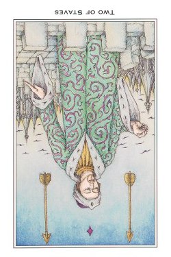 The 2 of Wands represents the research and digestion of a new idea. The number of this card and it's element are somewhat in conflict; while the 2 is focussed inwards, the Wand's element fire is outgoing. Fire wants to steam ahead while the blackbox 2 asks for patience.