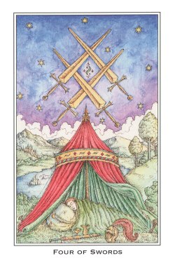 4 is the first number in the cycle of giving things shape. It's about making things real. The element of Swords also relates to making things real, so this enhances the effect so much that arrogance can cause you to exhaust yourself.