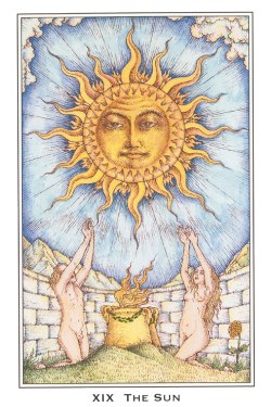 The Sun carries the number 19, a composed value of 1. This is the third composed 1 in the Major Arcana. It's the culmination of the 1's. The third 1 is a reward and a beginning at the same time. It also represents creative energy.