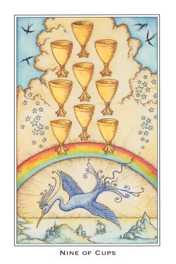 The 9 of Cups represents achievement and contentment. It is an excellent time to take some rest and enjoy yourself.