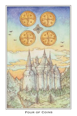 The 4 of Pentacles is about holding on to what you got. The number 4 represents structure and order, and fits well with the suit's element, Earth.