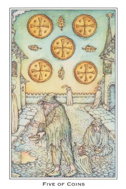 The 5 of Pentacles is an assignment-number card, and is about letting go of your securities. Pentacles element Earth (also) represents material posessions, so this card is about letting go of (some of) your worldly assets.