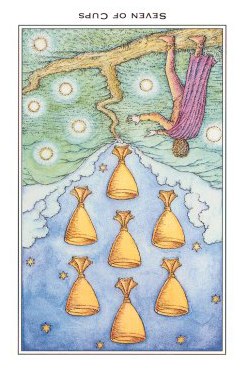The 7 of Cups is about making a choice between different ideals. But Cups, with the water element, don't like making definitive choices that much, making this 7 in this suit a bit of a hard choice.