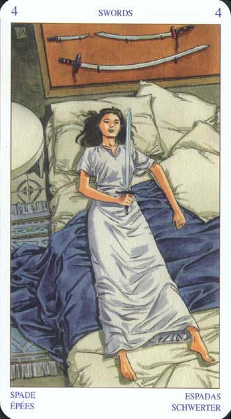 4 is the first number in the cycle of giving things shape. It's about making things real. The element of Swords also relates to making things real, so this enhances the effect so much that arrogance can cause you to exhaust yourself.