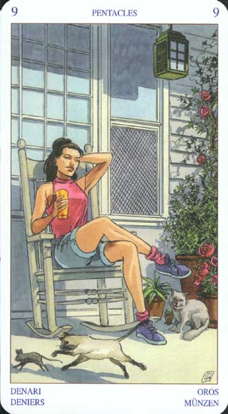 The 9 of Pentacles represents earned rest. The element Earth, attached to the Pentacles suit, appreciates the rest that completion of hard work brings. This is a good time for games and relaxation.