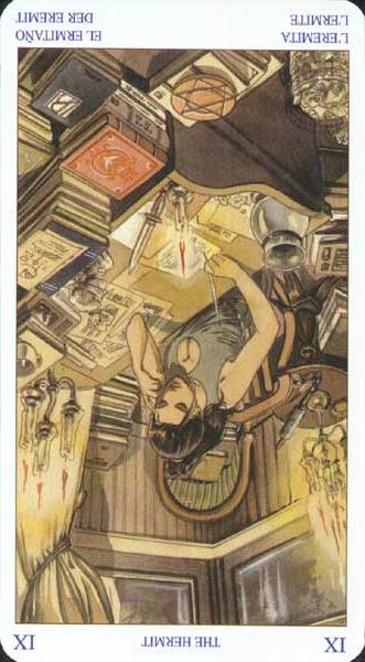 The Hermit shuts out the world and retreats into solitude to better understand some spiritual aspect of life. He opens to the cosmos and lets it's wisdom sink in. Hermits are often seen as wise old men who can guide a traveller along a journey.