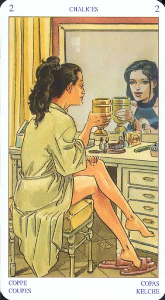 This the first assignment number of the Cups suit. Unlike Wands, with the Fire element, Cups, with the water element, has a lot more patience. Water is by nature more introspective, and this second card in the Cups suit is indeed about exploring yourself. The outcome is uncertain as always, but it usually results in better acceptance of yourself.