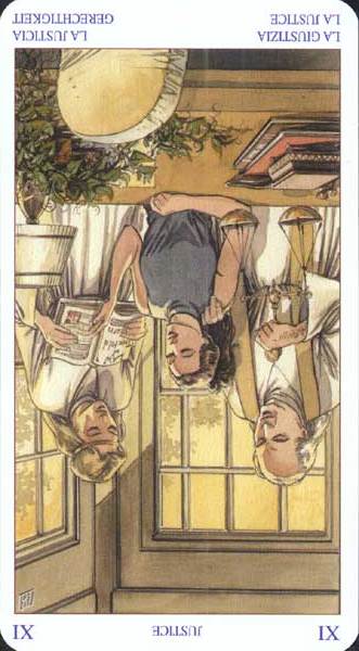 This card carries the number 11. In the Rider-Waite deck, Strength and Justice have swapped places because Waite saw links with the astrological signs Leo and Libra.