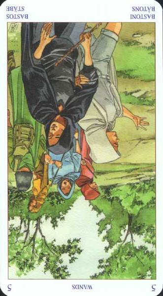 The 5 of Wands represents competition. The 5 is the second assignment number, and therefore a difficult card. 5 combined with the Wand's element fire challenges you. You'll have to fight hard for your idea, but you stand a good chance of succeeding.