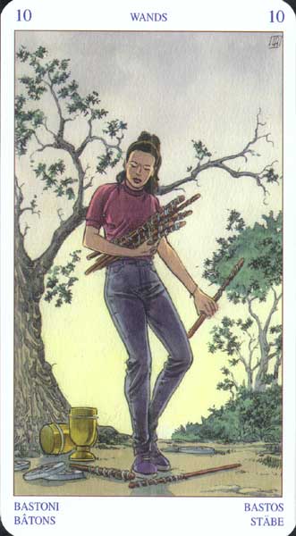 The 10 of Wands is therefore the transition from the element Fire (associated with Wands) to the element Water, associated with Cups. As you might imagine, this not the easiest of transitions.