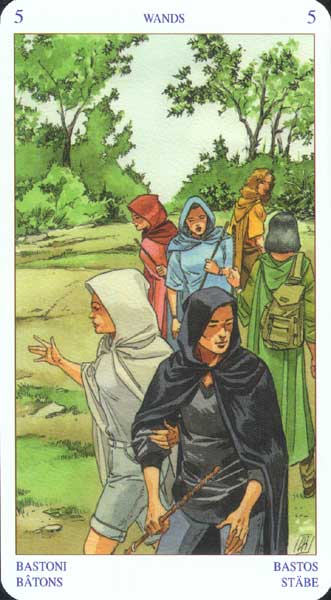 The 5 of Wands represents competition. The 5 is the second assignment number, and therefore a difficult card. 5 combined with the Wand's element fire challenges you. You'll have to fight hard for your idea, but you stand a good chance of succeeding.