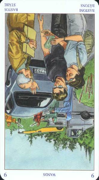 The 9 represents rest after work, which is another thing (like 8) that the element Fire associated with Wands is not very comfortable with. Fire likes to keep going. This rest will probably be spent thinking about what to do next along the course to completion.