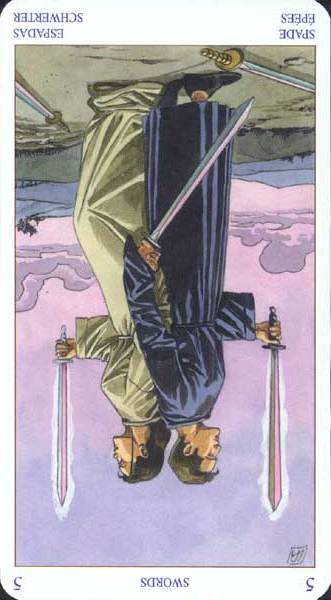 The 5 of Swords is about facing reality. The 5 is an assignment number, and in the slighly more difficult suit of Swords, it means you face a difficult challenge where your past experiences could hold you down.