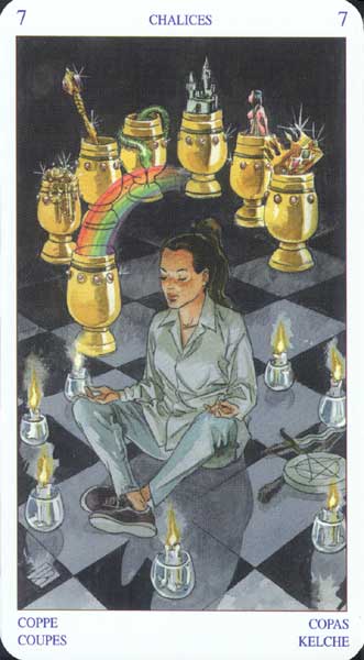 The 7 of Cups is about making a choice between different ideals. But Cups, with the water element, don't like making definitive choices that much, making this 7 in this suit a bit of a hard choice.