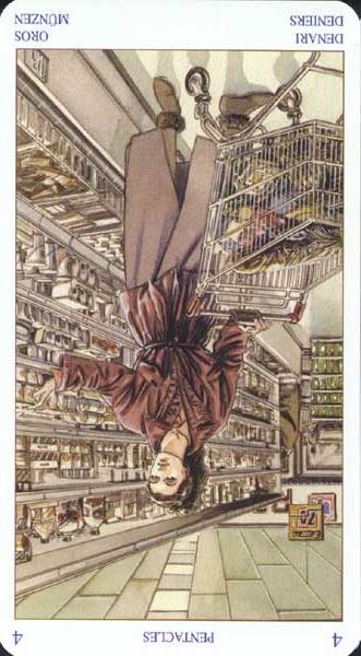 The 4 of Pentacles is about holding on to what you got. The number 4 represents structure and order, and fits well with the suit's element, Earth.