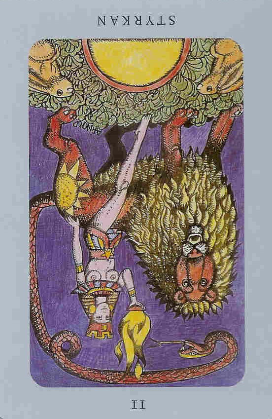 This card carries the number 11. In the Rider-Waite deck, Strength and Justice have swapped places because Waite saw links with the astrological signs Leo and Libra.