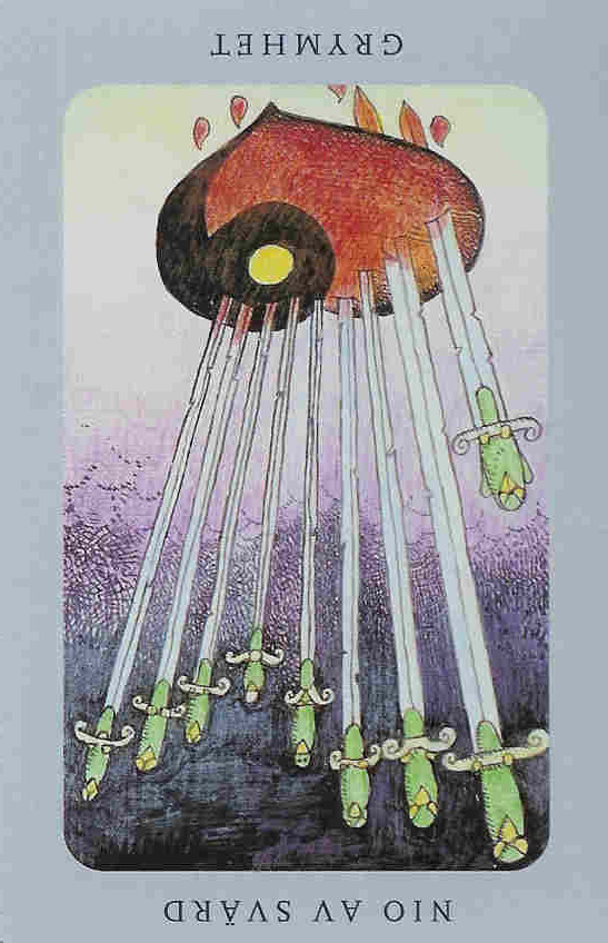 The 9 of Swords represents relief from cropped-up grief. The number 9 is a number of reward and rest and accomplishment. In the element of Swords there is not a lot of time for rest, but without any rest you'd just burn yourself out.