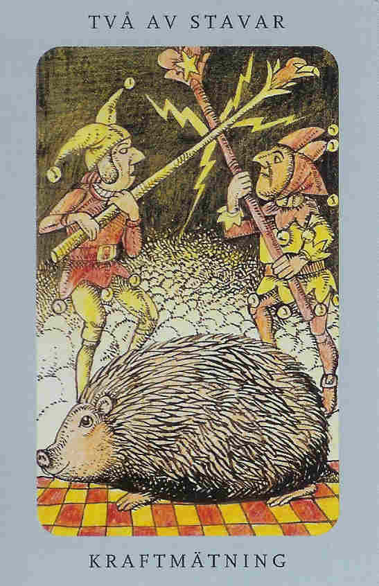 The 2 of Wands represents the research and digestion of a new idea. The number of this card and it's element are somewhat in conflict; while the 2 is focussed inwards, the Wand's element fire is outgoing. Fire wants to steam ahead while the blackbox 2 asks for patience.