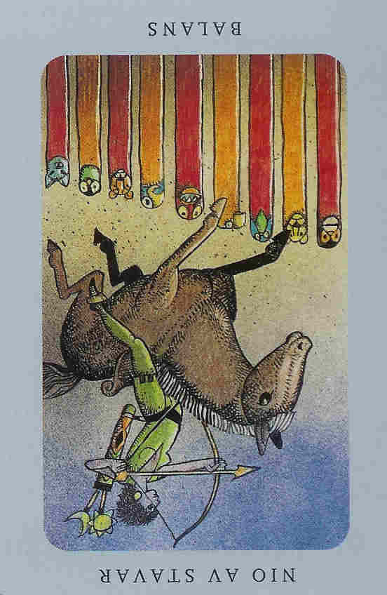 The 9 represents rest after work, which is another thing (like 8) that the element Fire associated with Wands is not very comfortable with. Fire likes to keep going. This rest will probably be spent thinking about what to do next along the course to completion.