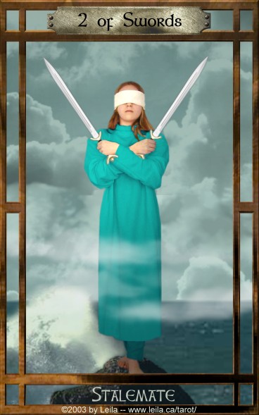 The 2 is an assignment number in tarot, and in this case of the 2 of Swords, it's about being forced to wait for something, often even while blindfolded in some sense.