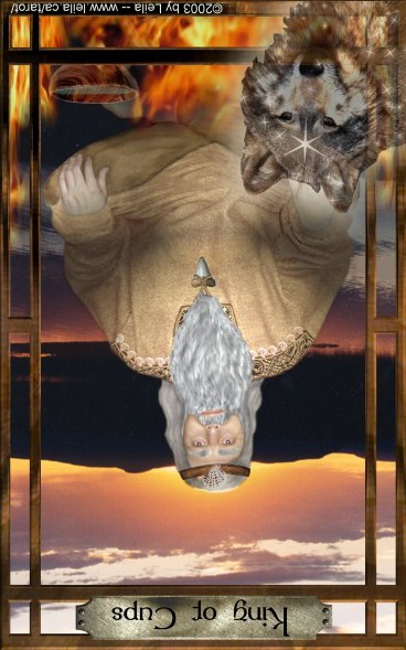 The King of Cups uses his intuition to achieve his ideals. Since Cups are turned inward, and Kings turned to the outside world, this card might be a difficult one, or it could be a powerful one.