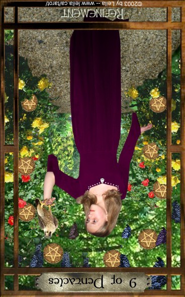 The 9 of Pentacles represents earned rest. The element Earth, attached to the Pentacles suit, appreciates the rest that completion of hard work brings. This is a good time for games and relaxation.