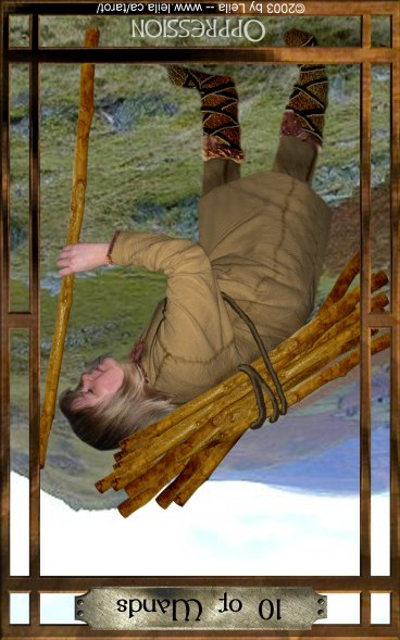 The 10 of Wands is therefore the transition from the element Fire (associated with Wands) to the element Water, associated with Cups. As you might imagine, this not the easiest of transitions.