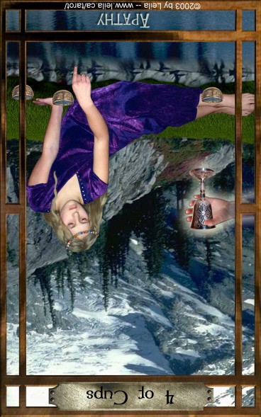 With the 4, the second cycle of this suit is commenced, where a choice between structure and feeling has to be made, where old securities have to be let go of to work towards a new future. But like Wands, Cups don't like structure much, they prefer to be free and dream rather than to make commitments and go for something.