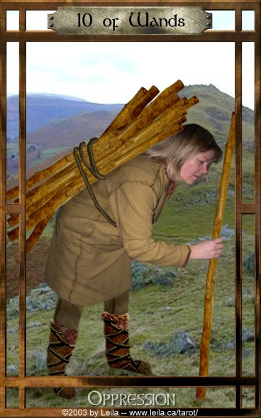 The 10 of Wands is therefore the transition from the element Fire (associated with Wands) to the element Water, associated with Cups. As you might imagine, this not the easiest of transitions.